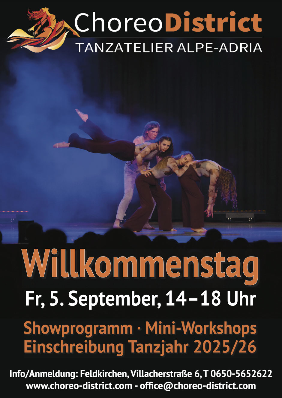 ChoreoDistrict - Tanzatelier Alpe-Adria lädt am Freitag, dem 7. September 2018 wieder zu einem Willkommenstag mit Showprogramm und Mini-Workshops ein. Ihr habt euch noch nicht entschieden? Kein Problem, ihr könnt jederzeit vorbeikommen, eine E-Mail schicken, online buchen oder mich kontaktieren. Workshops für Erwachsene (Yoga, Ballett, Streetjazz, ...) auf Anfrage.
